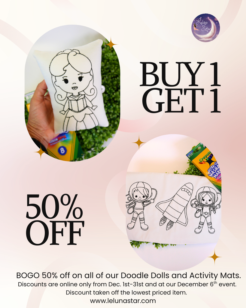 Buy one Doodle Doll or Activity Mat and get another for half off. No discount code needed. Sale ends December 31st.