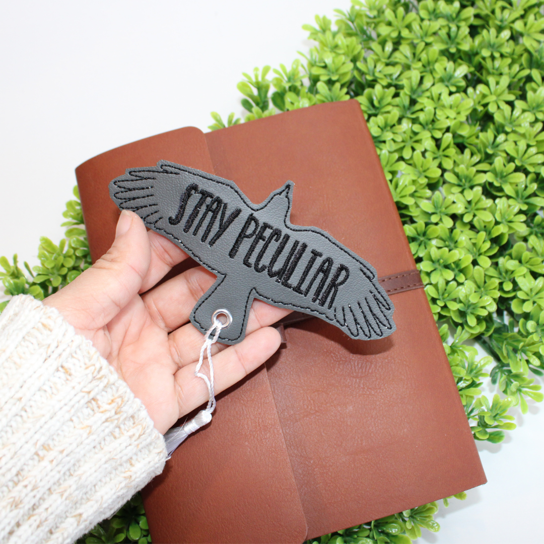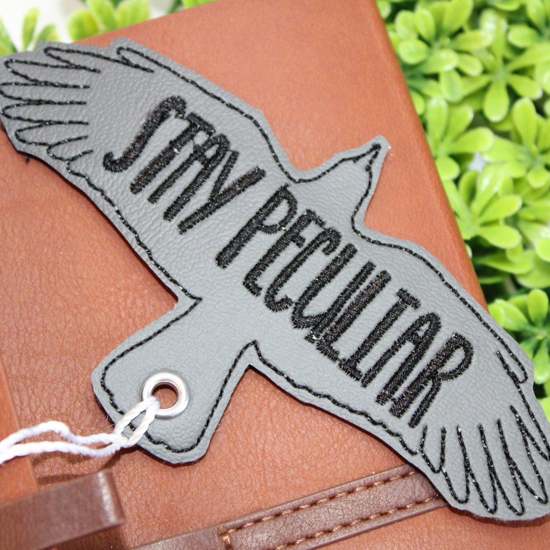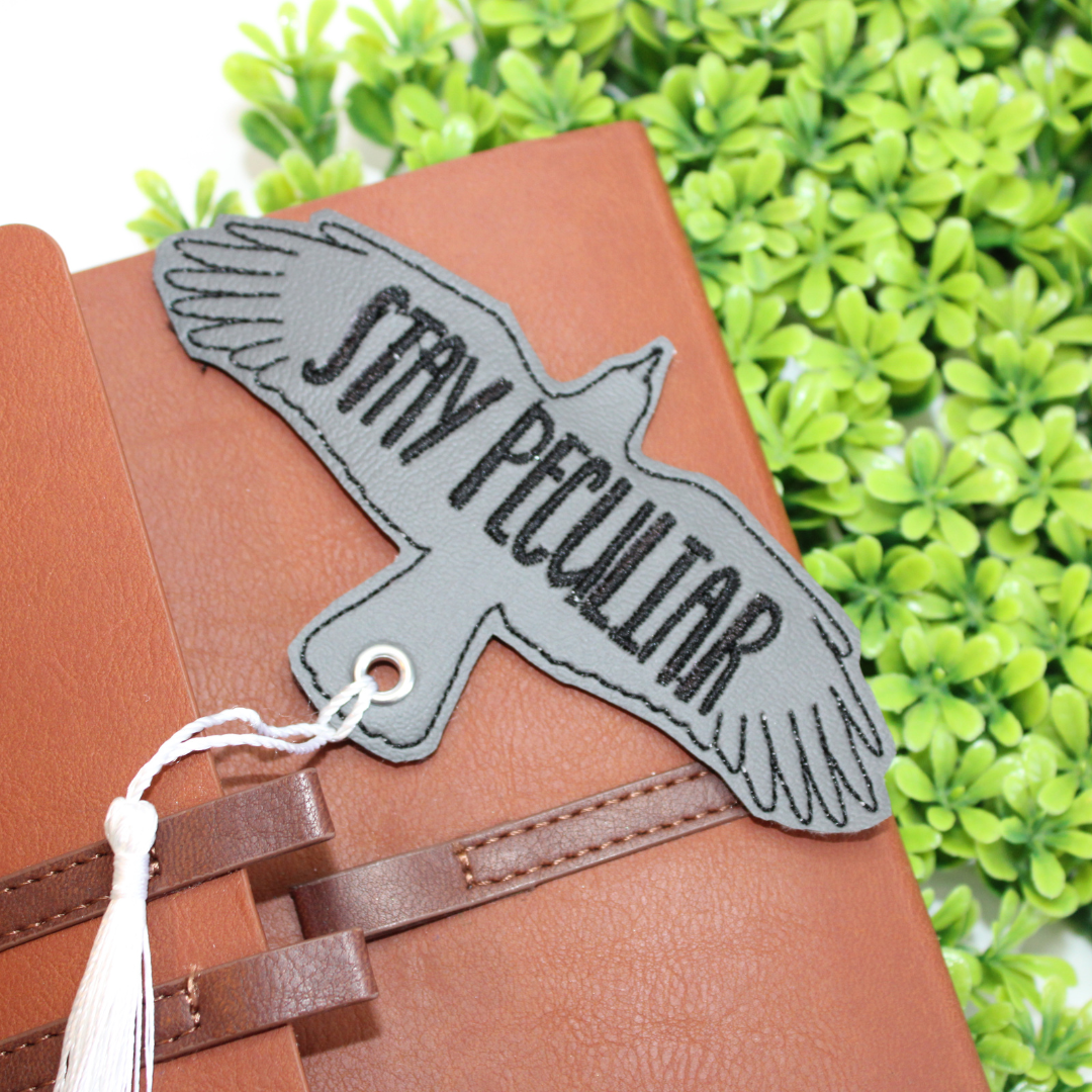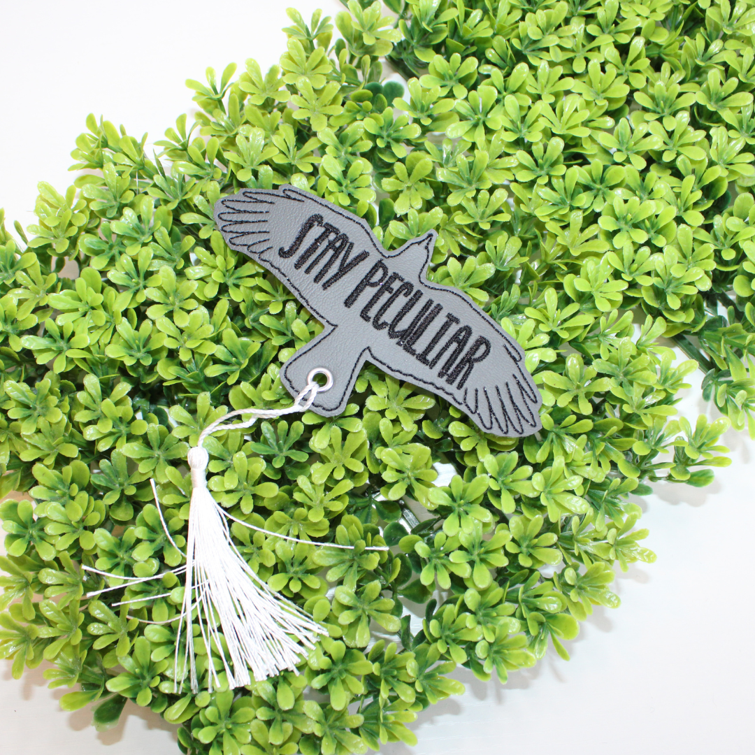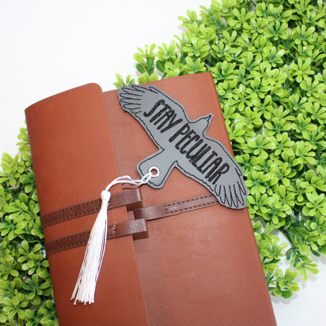 This bookmark is approximately 3" x 5" in size and is made with a dark grey marine vinyl (faux leather) with embroidered details stitched onto the fabric.