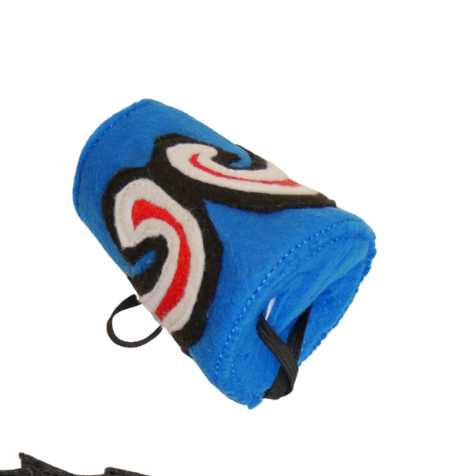The fez hat is made with matching charcoal grey felt or blue felt with details made from black and white felt and red thread. The fez hat has elastic attached and can be tied wherever is comfortable for the wearer.