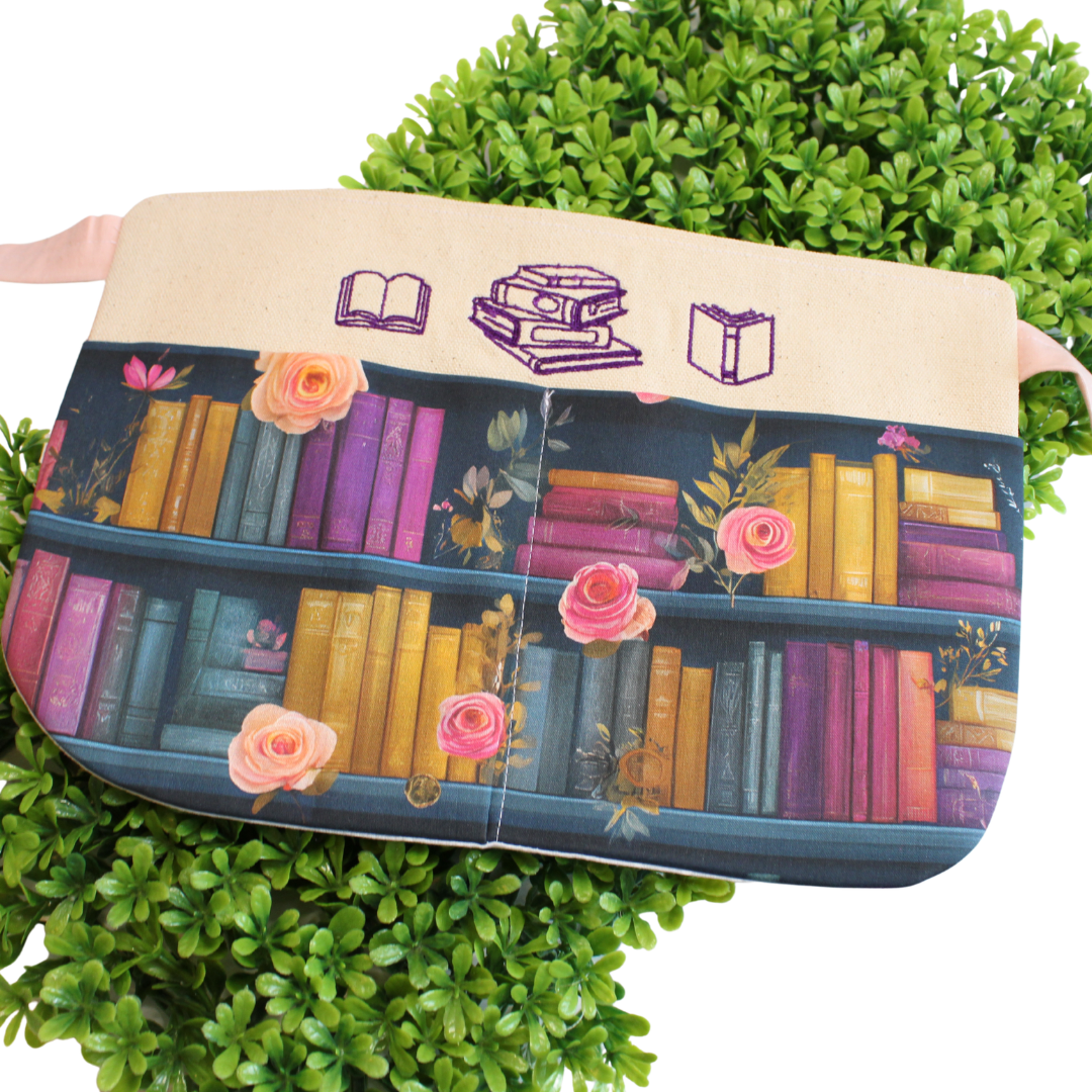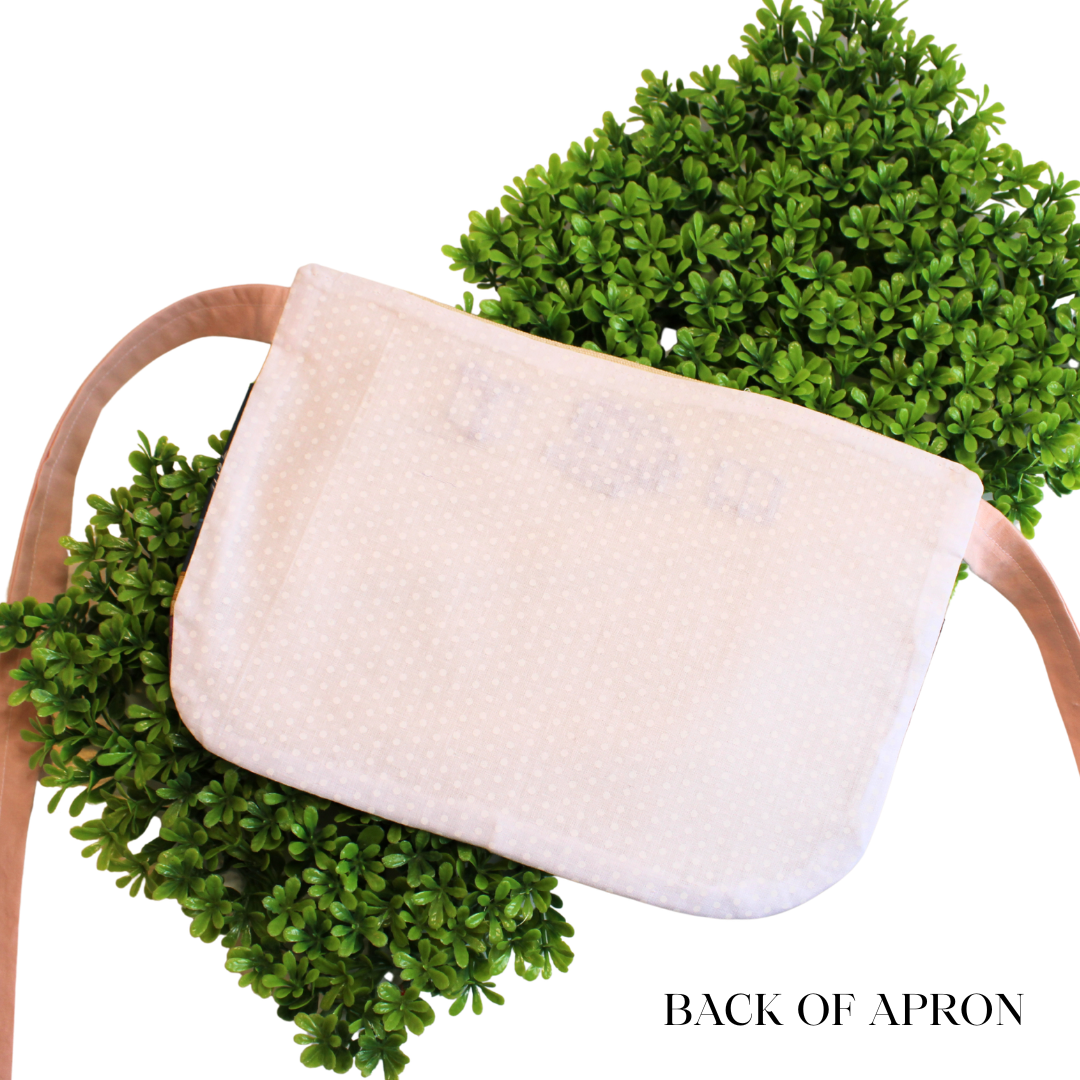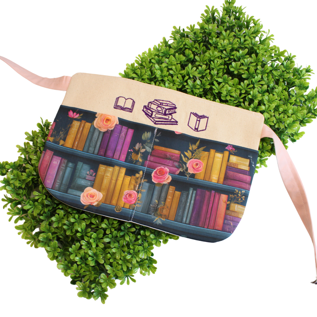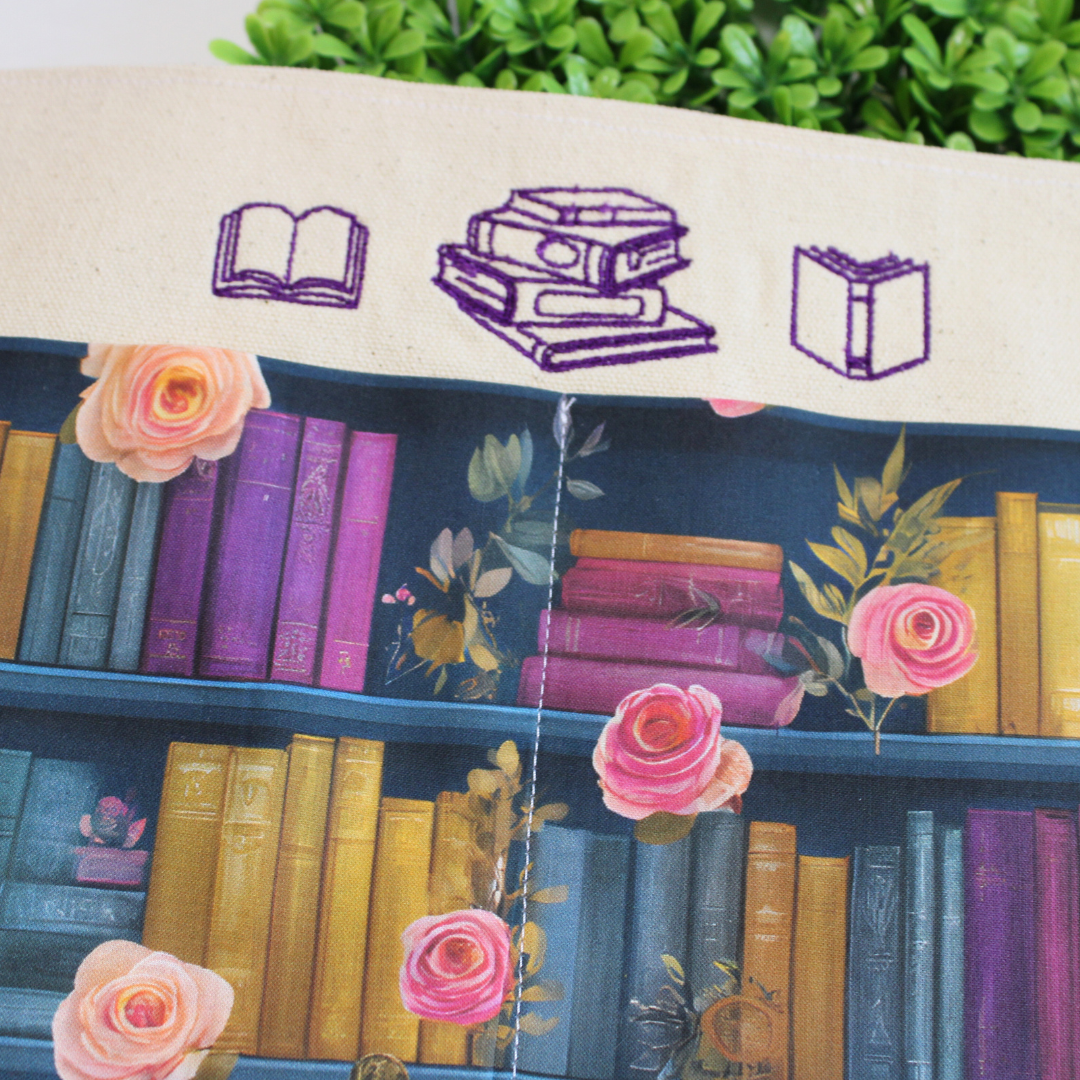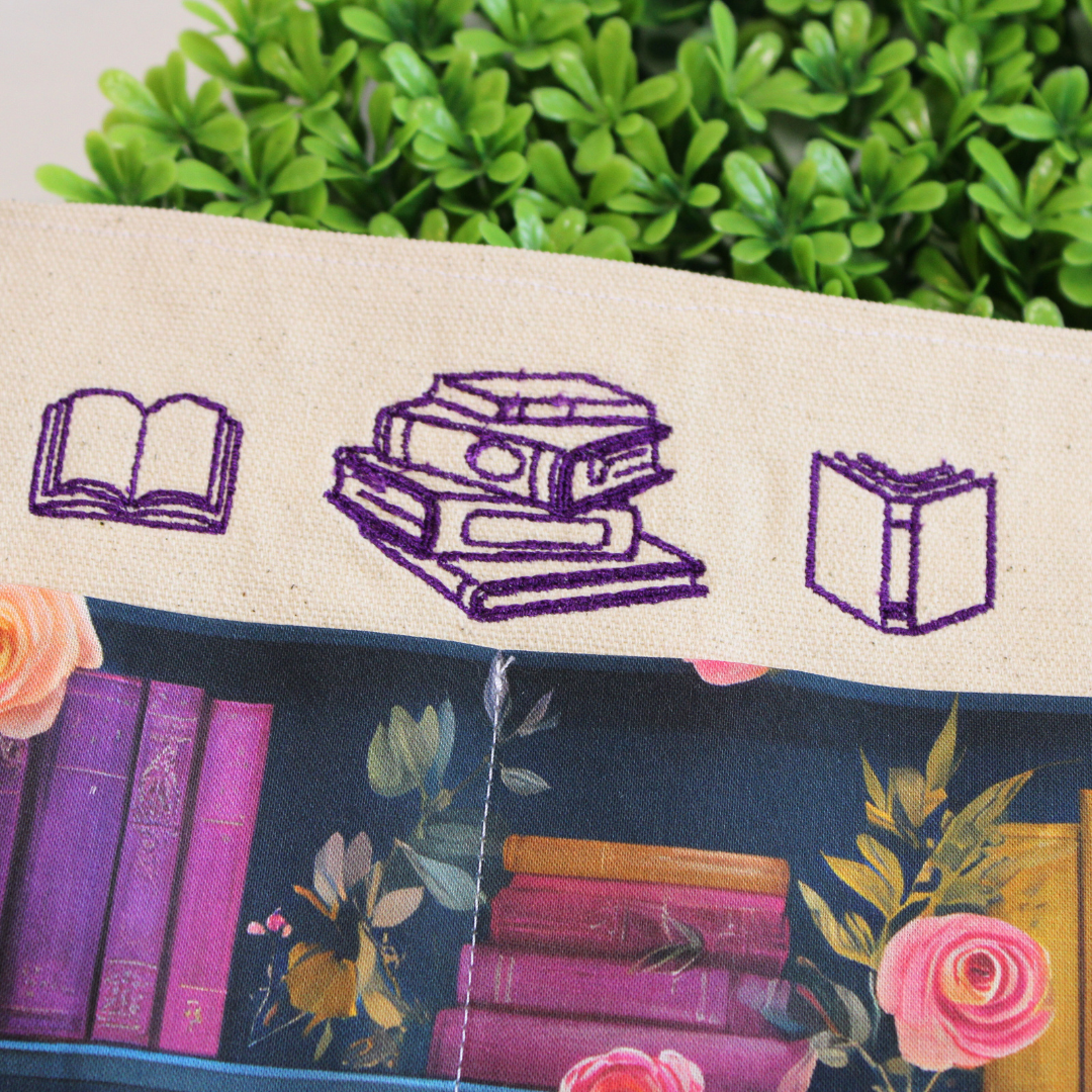 The Book Lover Activity Apron is made from beautiful cotton featuring a bookshelf full of vibrant books and beautiful flowers. The embroidery detail features three different book designs stitched in matching purple thread. The apron is made from a durable canvas fabric. See specific fabric details below: