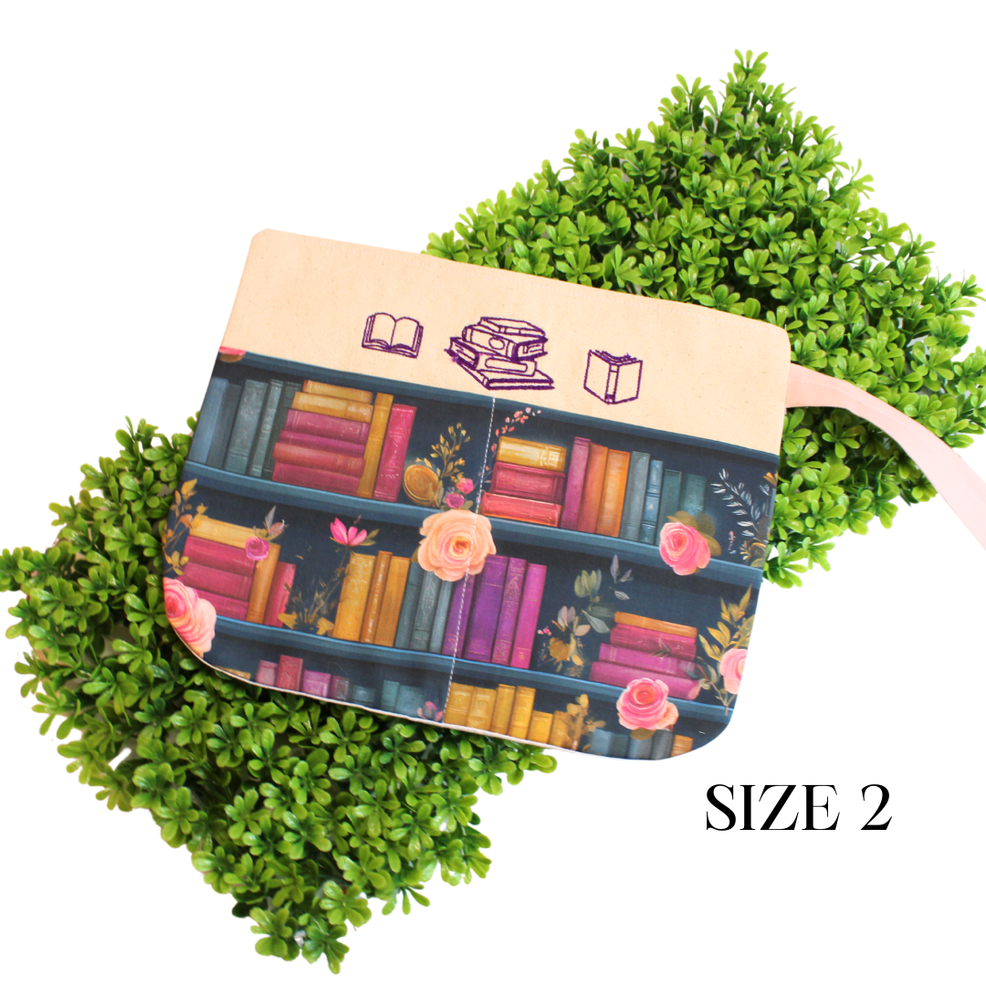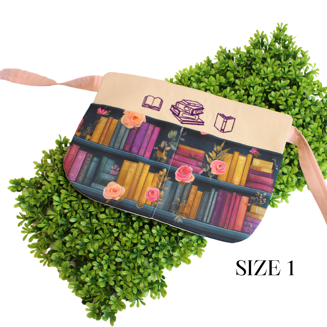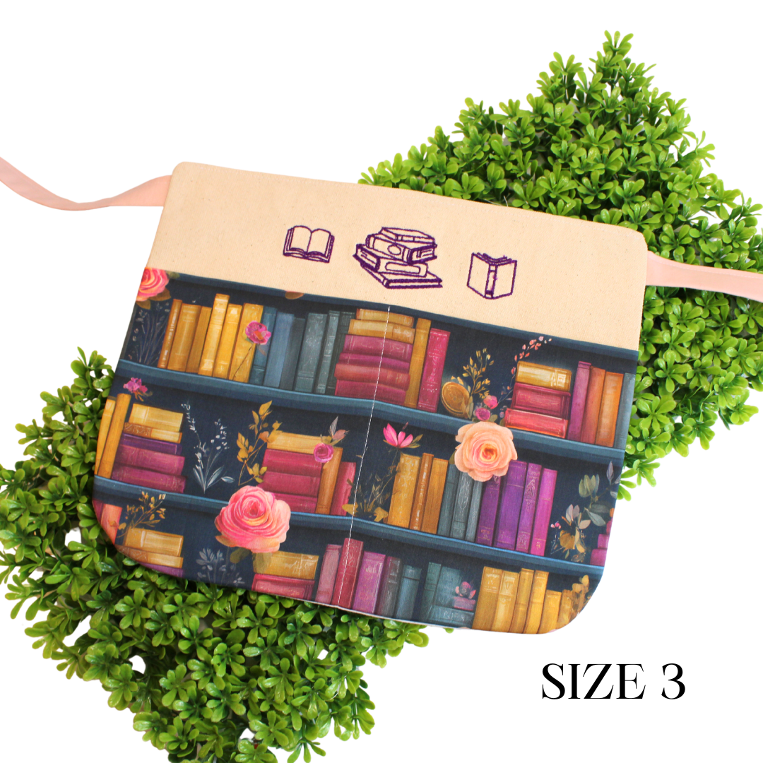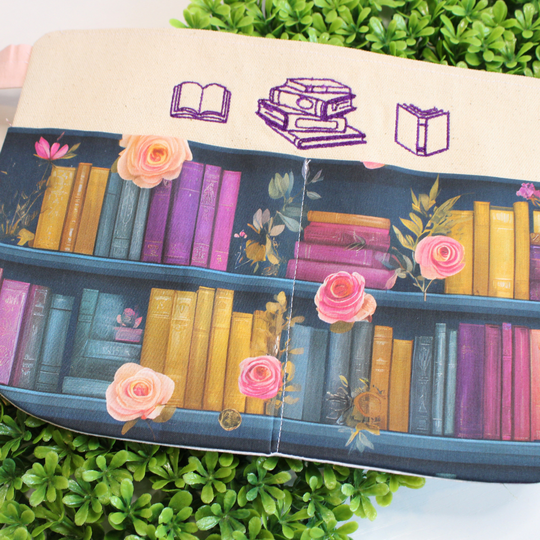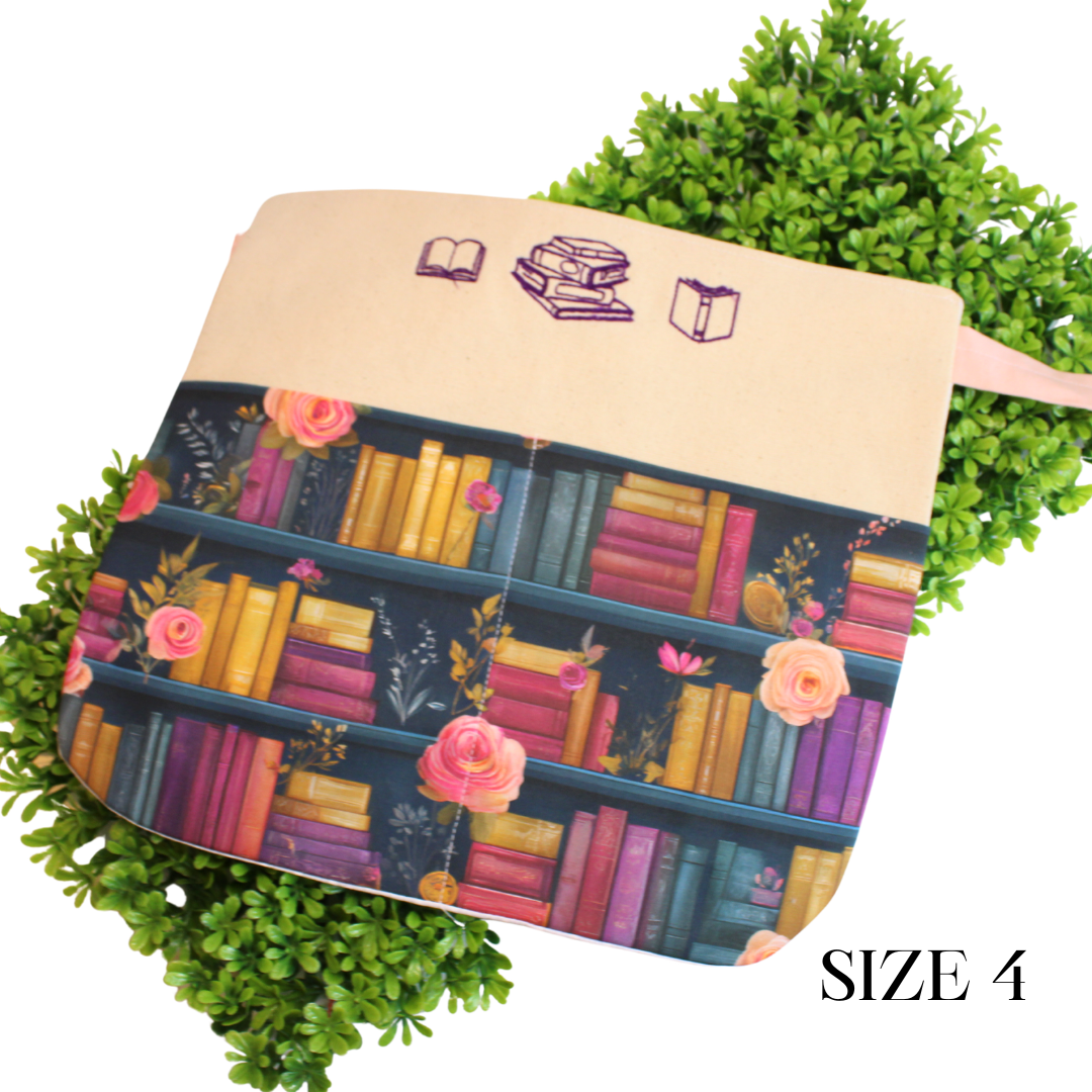 The Book Lover Activity Apron is made from beautiful cotton featuring a bookshelf full of vibrant books and beautiful flowers. The embroidery detail features three different book designs stitched in matching purple thread. The apron is made from a durable canvas fabric. See specific fabric details below: