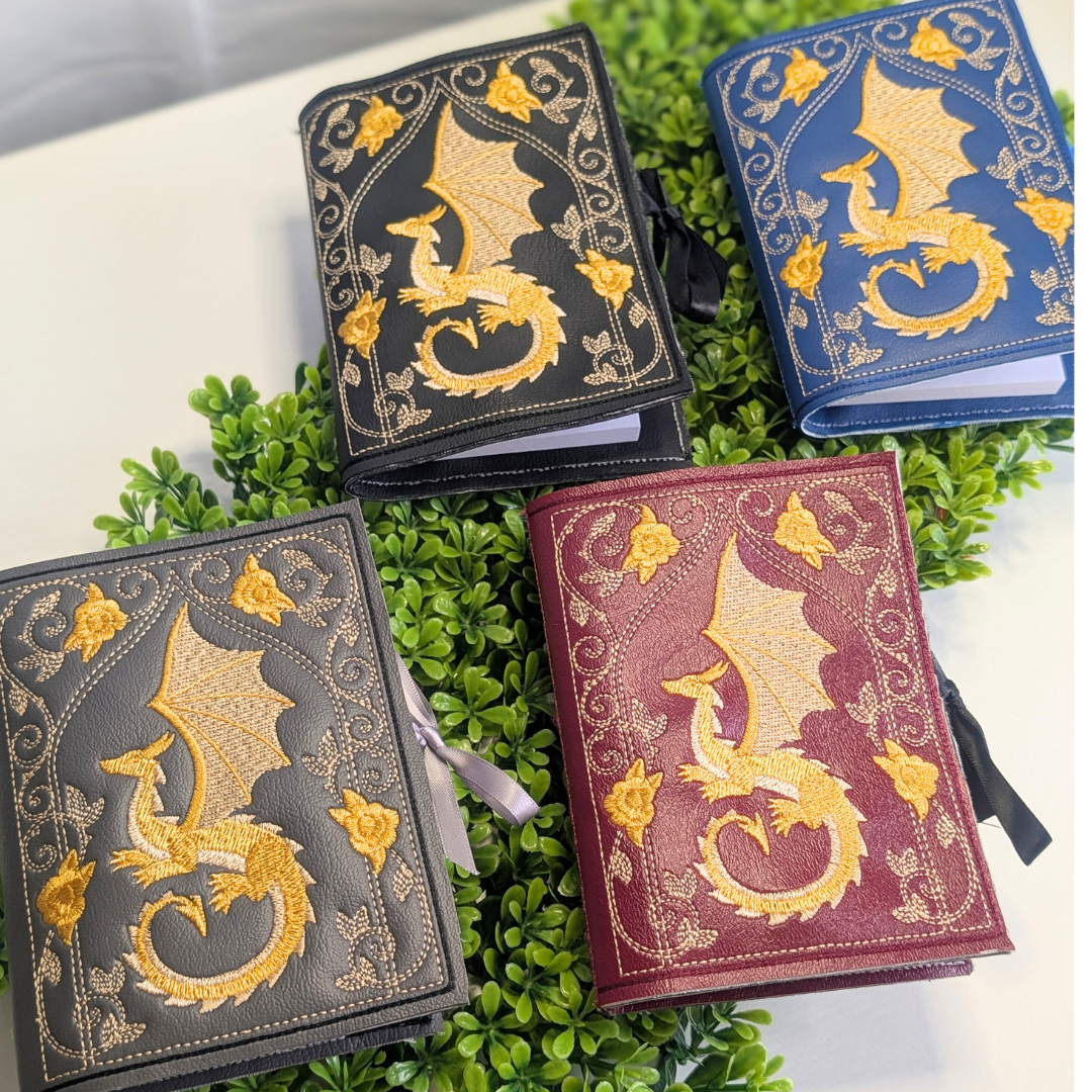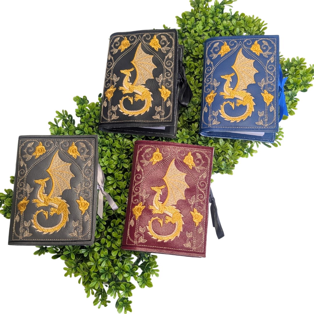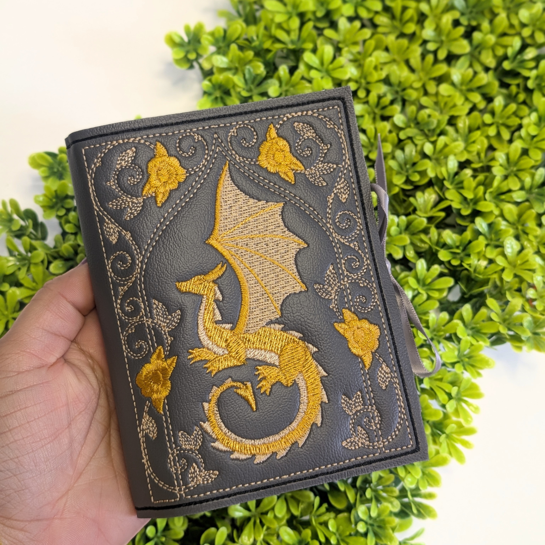 Crafted from premium faux leather in grey, black, maroon, or blue, this Dragon Notepad combines functionality with refined aesthetics. The cover features an intricately stitched design in dual-tone gold thread, creating visual depth and elegance. A coordinating ribbon closure keeps your pages secure wDraghile adding a touch of luxury. Ideal for capturing ideas, sketches, or daily reflections with understated style.