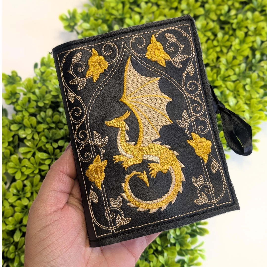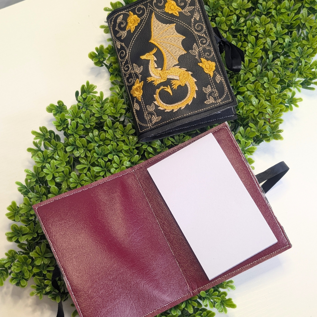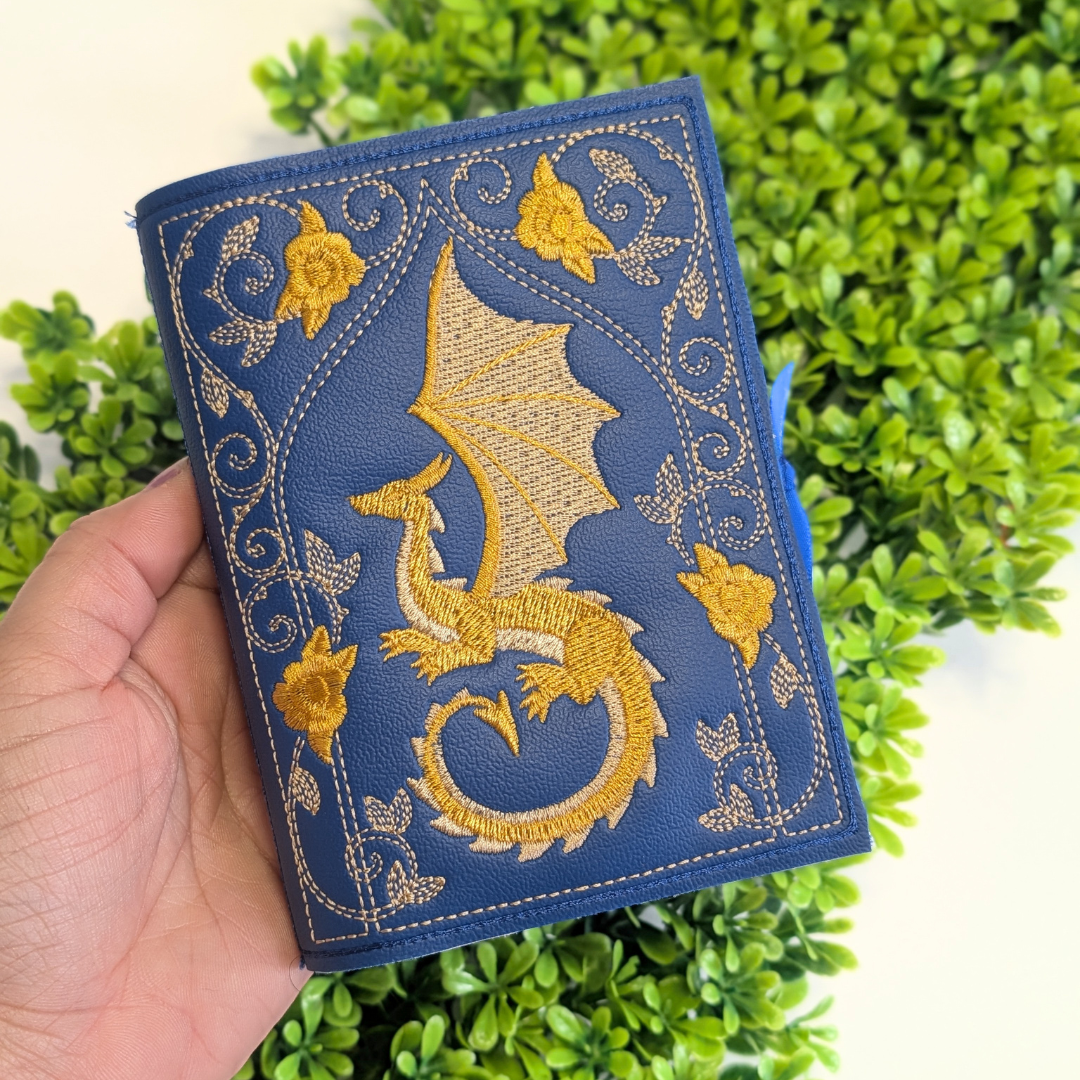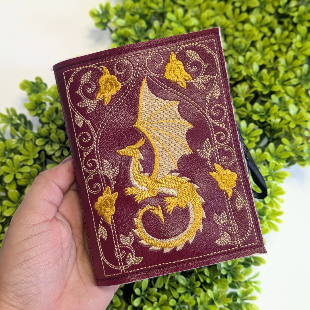 Crafted from premium faux leather in grey, black, maroon, or blue, this Dragon Notepad combines functionality with refined aesthetics. The cover features an intricately stitched design in dual-tone gold thread, creating visual depth and elegance. A coordinating ribbon closure keeps your pages secure wDraghile adding a touch of luxury. Ideal for capturing ideas, sketches, or daily reflections with understated style.