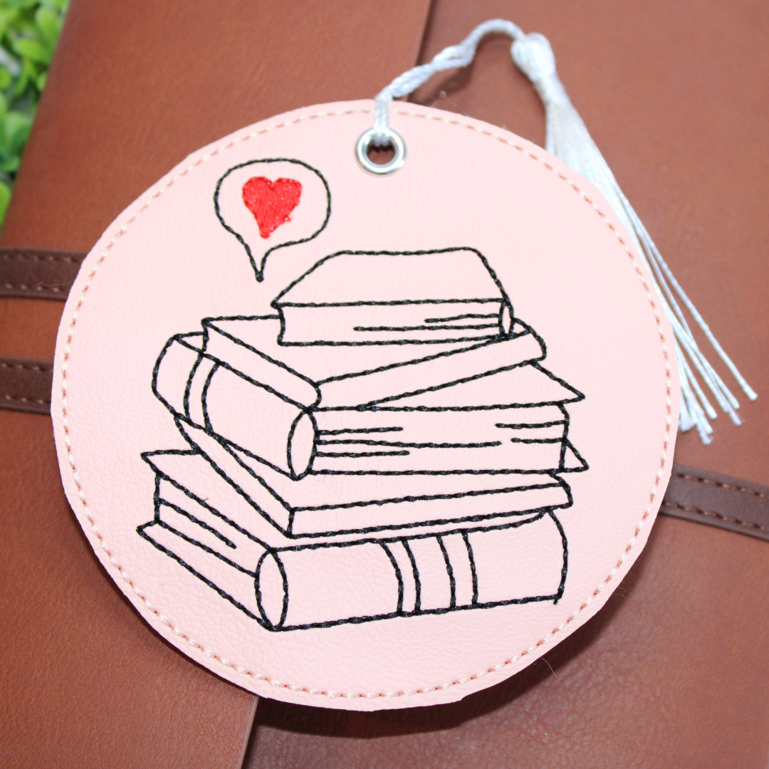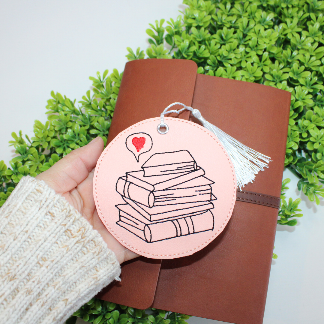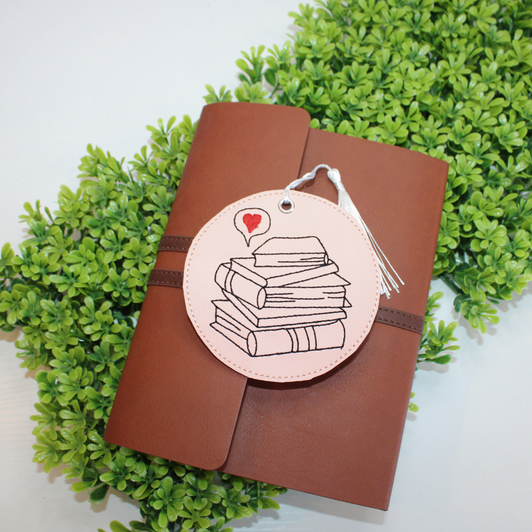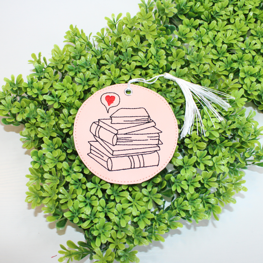 This bookmark is approximately 4" in size and is made with a peach marine vinyl (faux leather) with embroidered details stitched onto the fabric.