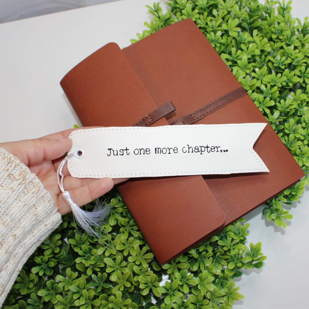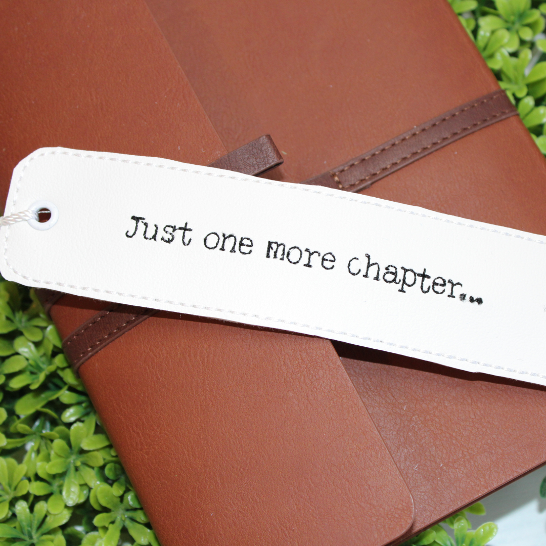 This bookmark is approximately 1.5" x 7" in size and is made with a white marine vinyl (faux leather) with embroidered details stitched onto the fabric.