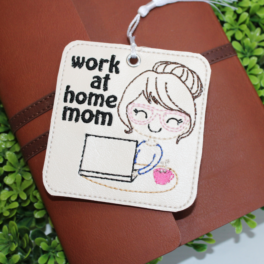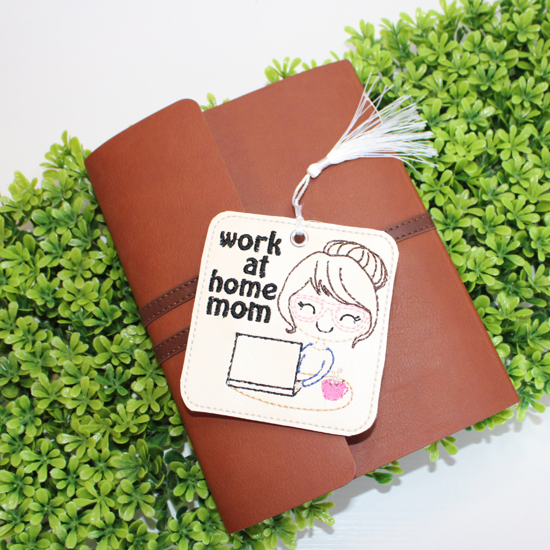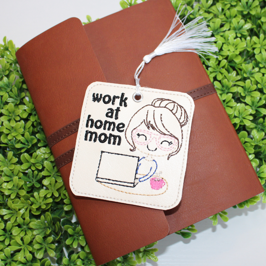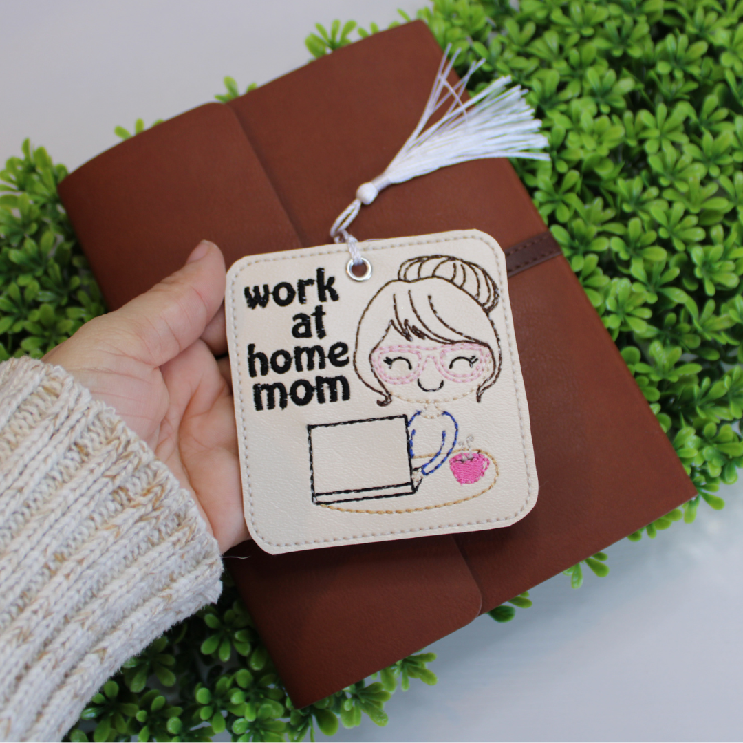 This bookmark is approximately 3.5" in size and is made with a beige marine vinyl (faux leather) with embroidered details stitched onto the fabric.
