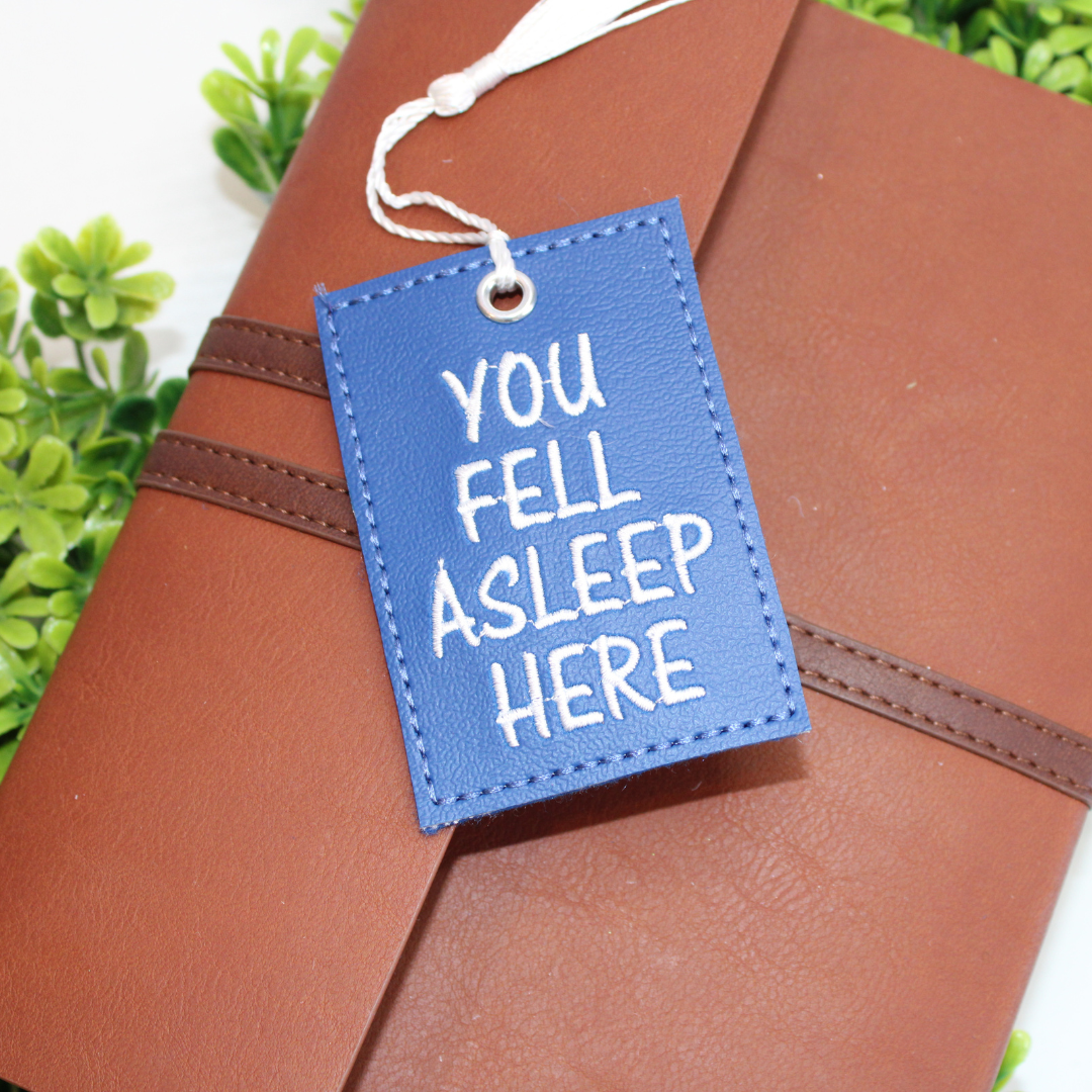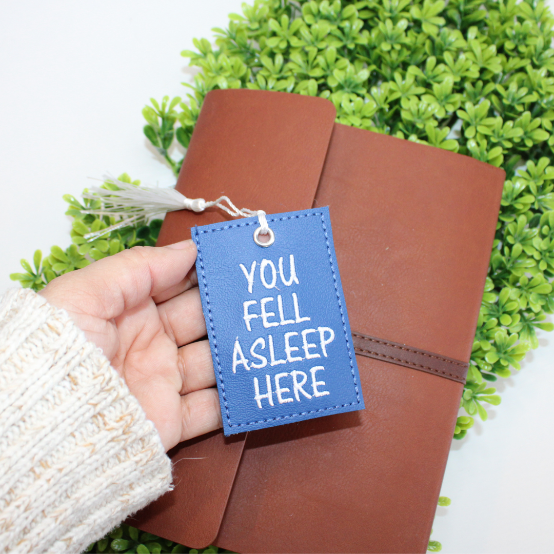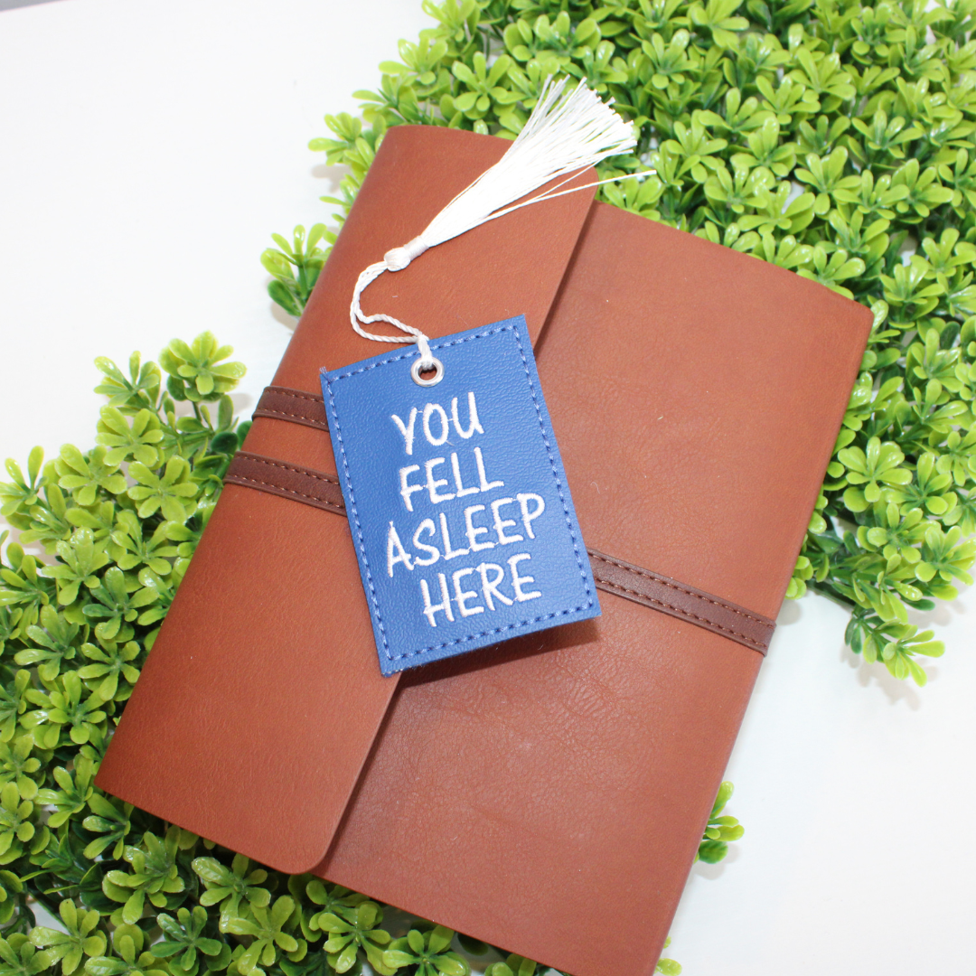 This bookmark is approximately 2" x 3.5" in size and is made with a tan marine vinyl (faux leather) with embroidered details stitched onto the fabric.